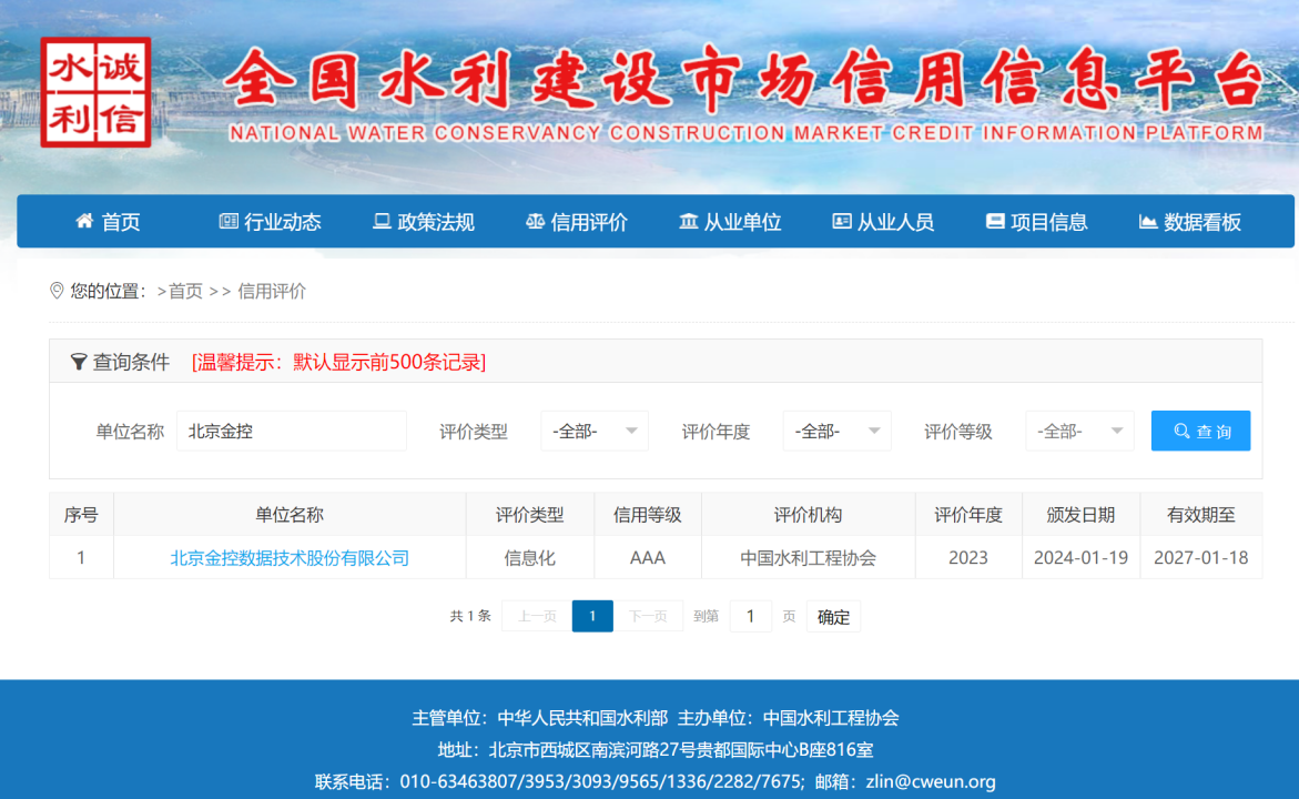 2024年1月19日,中國水利工程協會發布了《關于2023年度水利建設市場主體(供貨、信息化單位)信用評價結果的公告》。在此次評價中,金控數據以其卓越的綜合實力和良好的信用記錄,榮獲“全國水利建設市場主體AAA級信用評價”。
